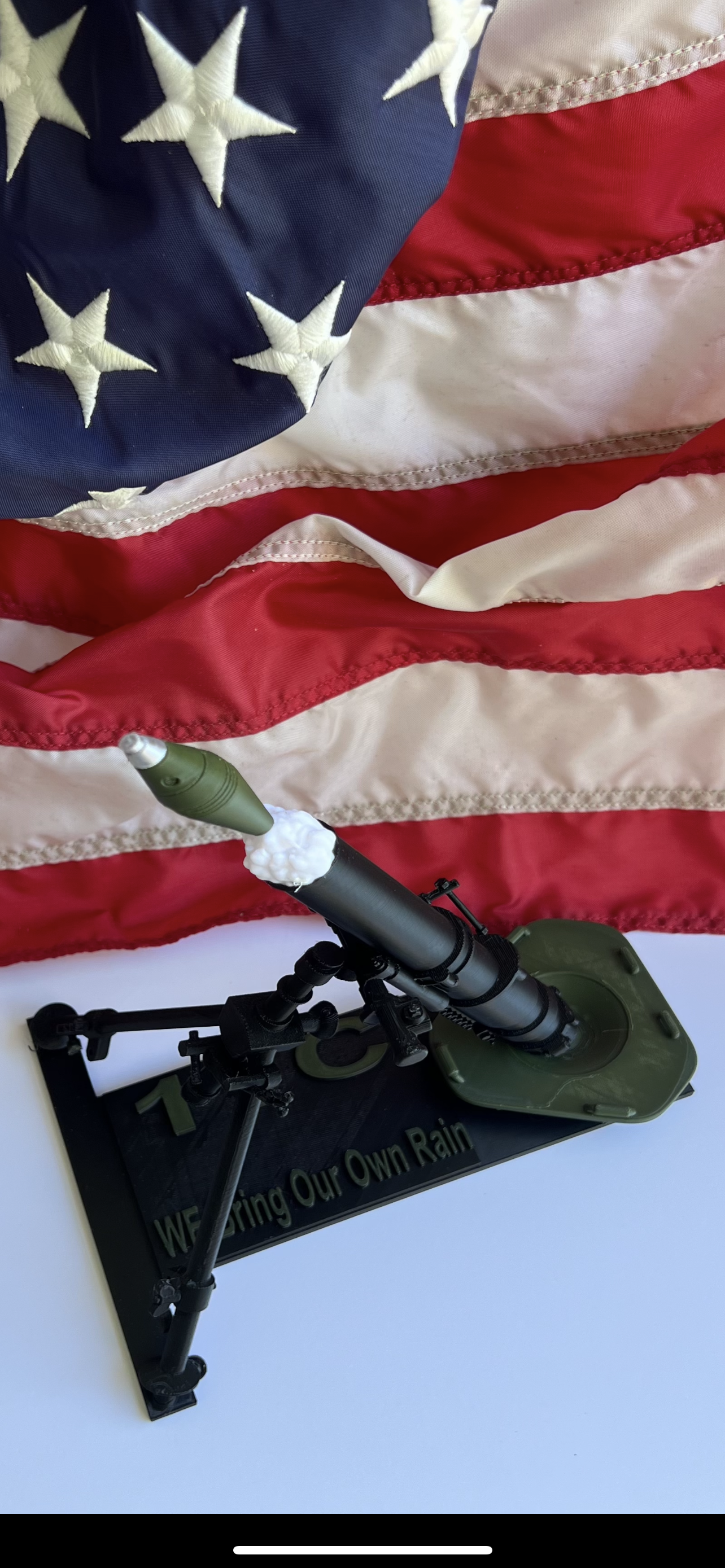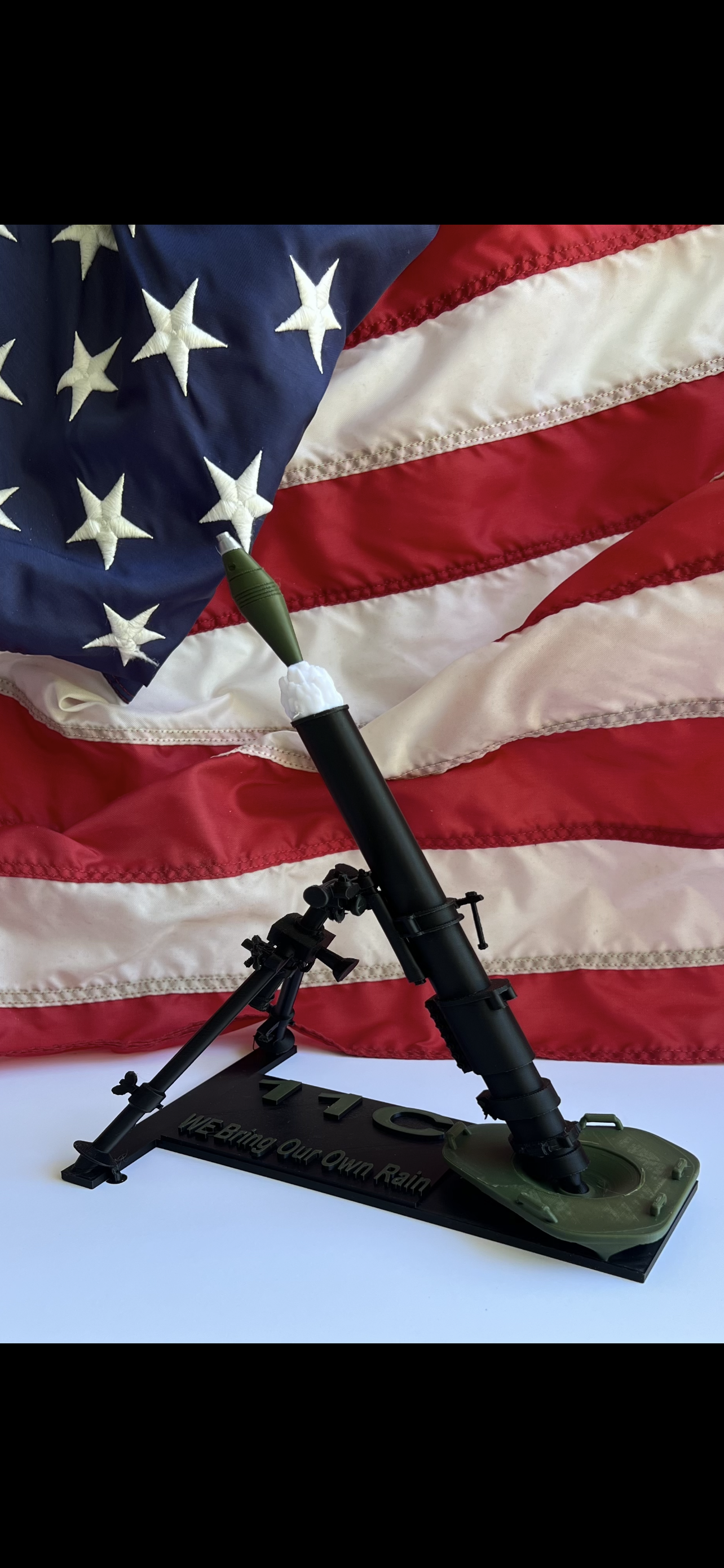 I am proud to offer my design and 3d print in color of a mortar system. this would make a great going away/ retirement gift. This would be a great show your pride of being an army Indirect Fire Infantryman 11C. We bring our own rain on the plate.