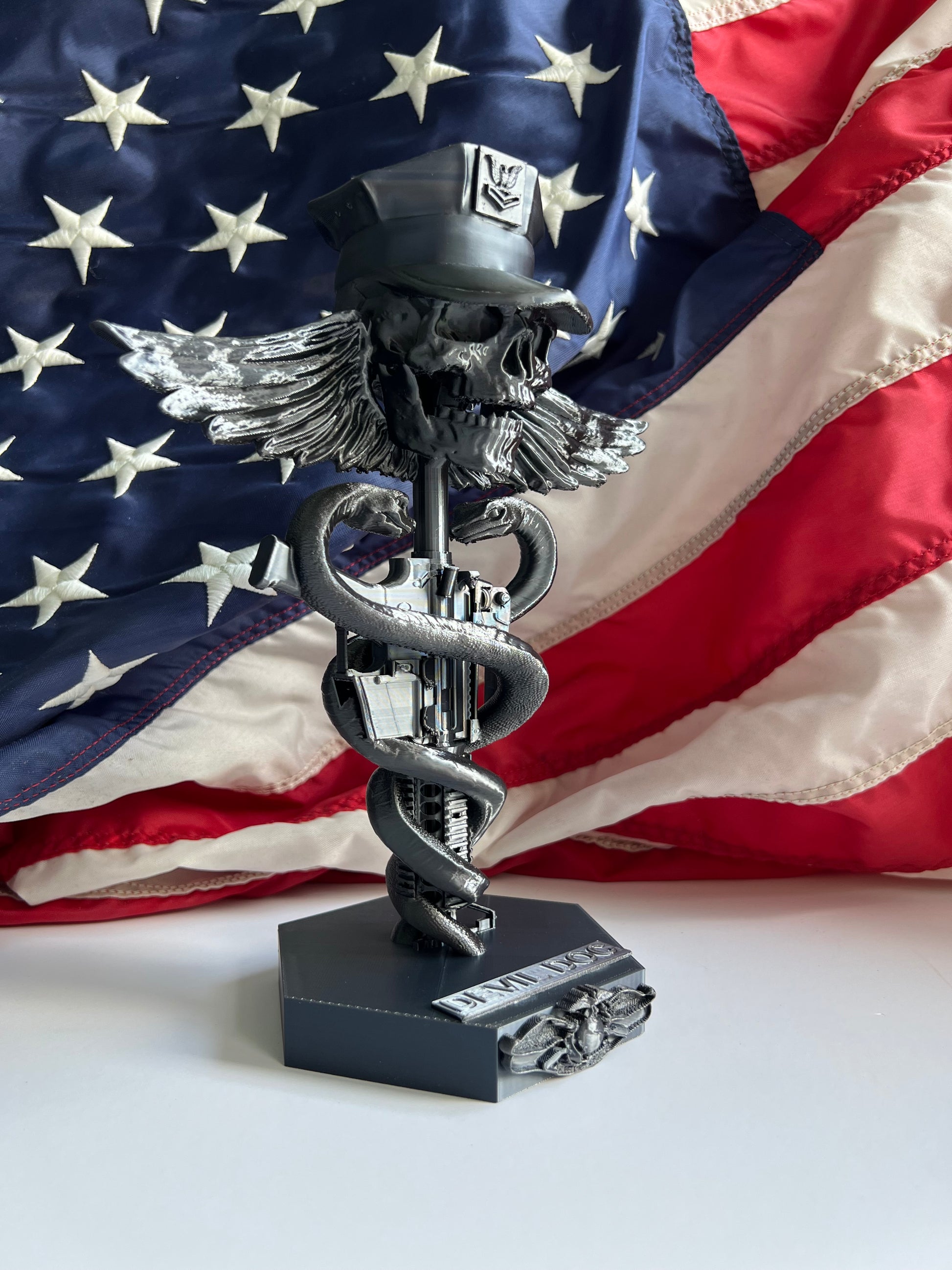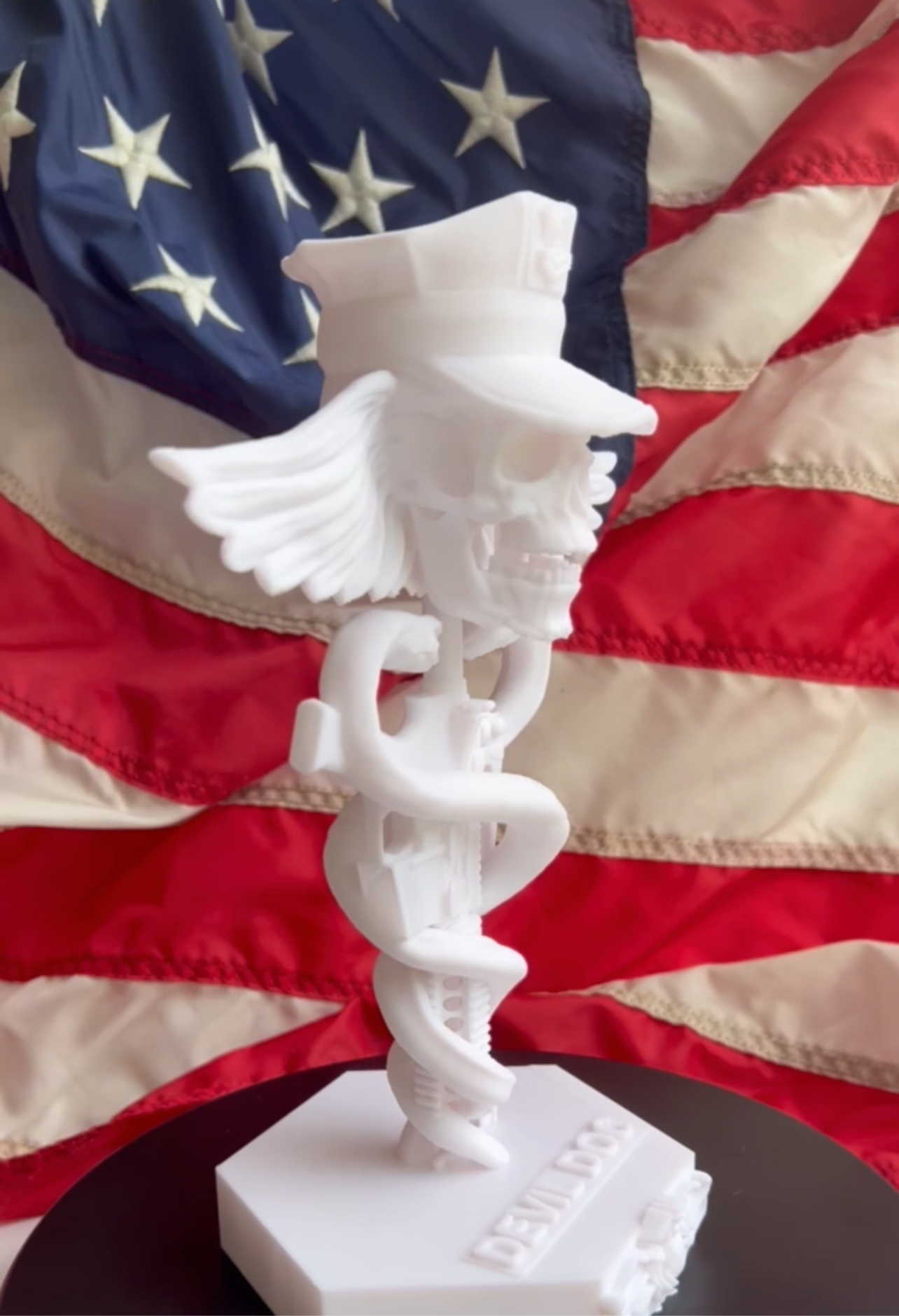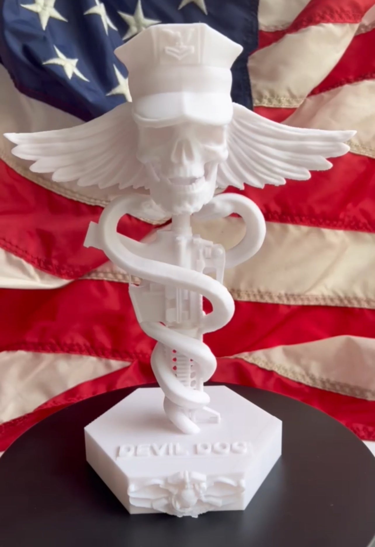 This Is my rendering of the Devil Doc in a 3d print. This print comes with Enlisted rank as well as the FMF warfare pin on the base. This is a paintable print to show off you FMF Corpsman pride or as a retirement gift. This is a very highly detailed 3d print
