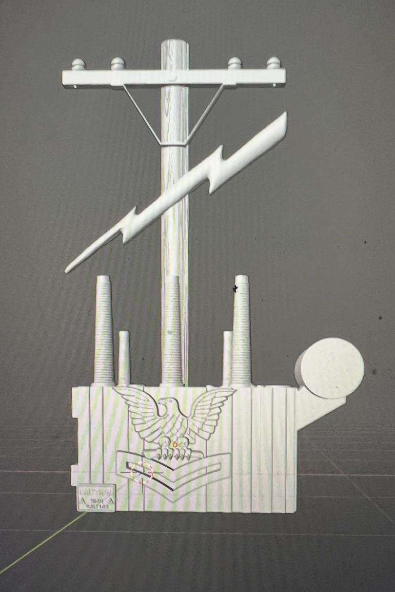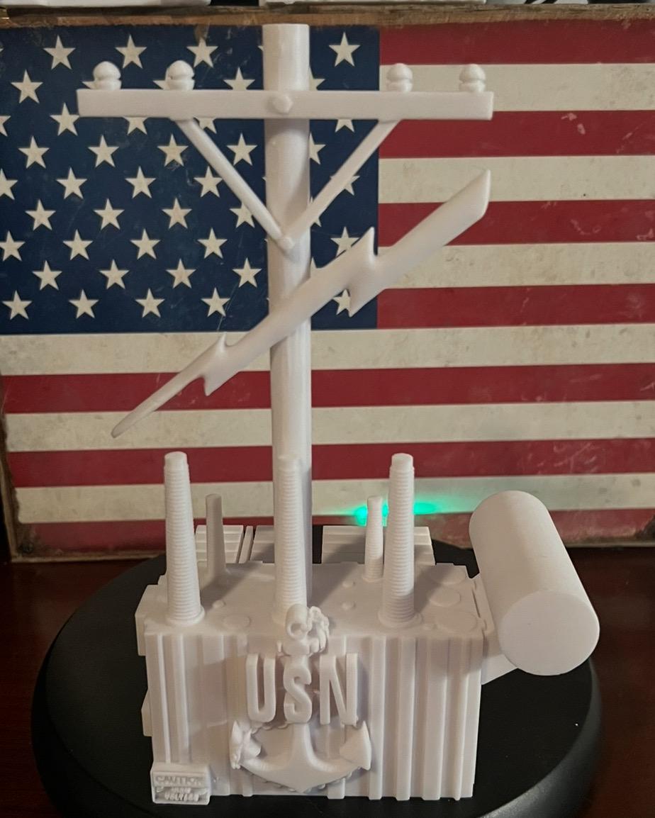 The Seabee CE rating badge with utility pole and lightning bolt made into a 3d model with added aspects of their job in the Military from the detailed wood grain pole to the base which is a high voltage transformer to keep it elevated. This is my design and is one of a kind paintable 3d print. This a great add for any Seabee CE to display their pride not only as Seabee CE but also as being a part of the Military Naval Construction Force.3% of all direct profit goes to mission 22 to support Vets.