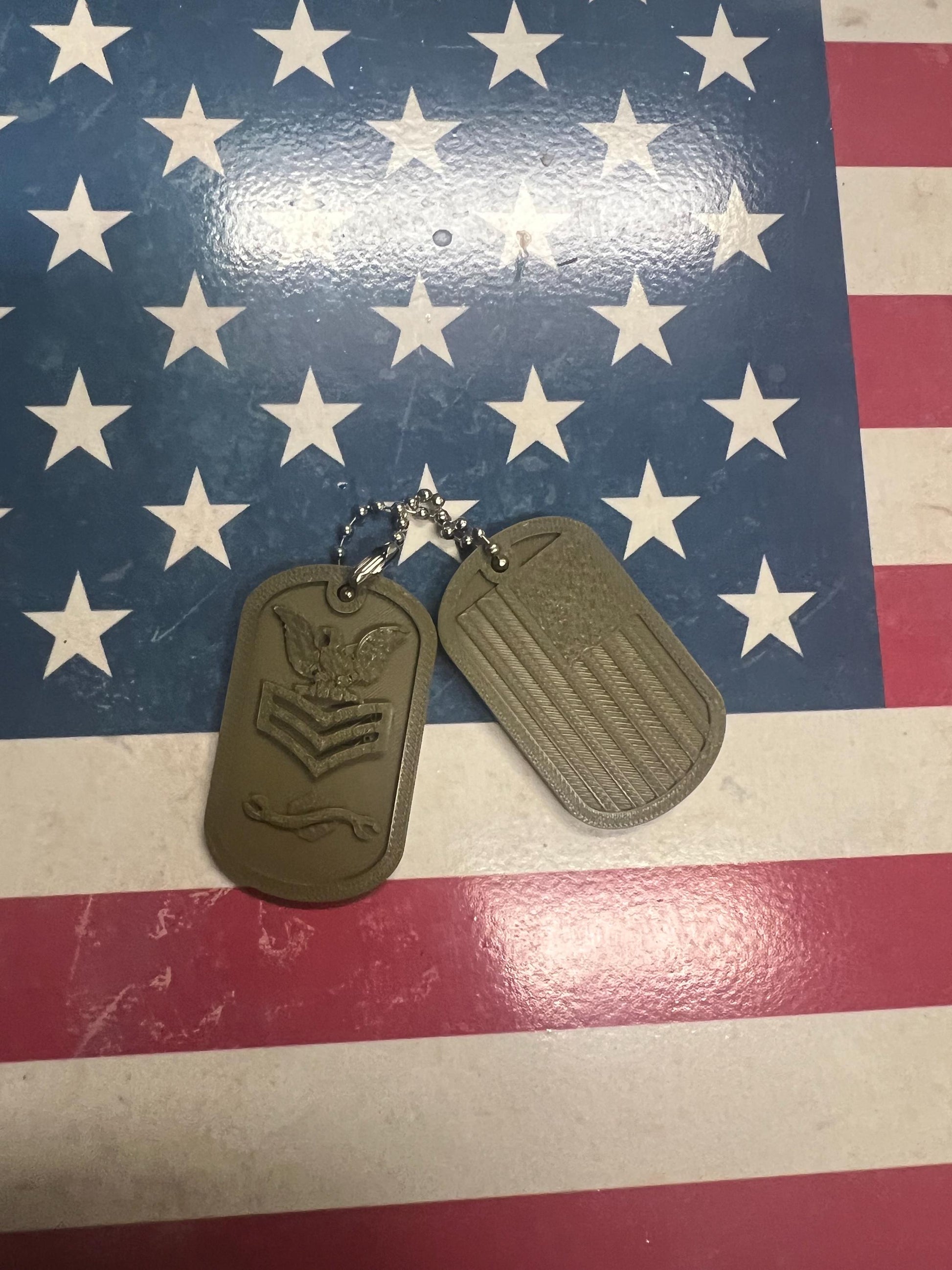 3D printed in OD green dog tags with the Construction Mechanic-Seabee CM- rating and a rank. This item comes with 2 dog tags and chain for your key ring or to ware. 1 rate and rank dog tag and one American flag dog tag. The dog tags are 100% the size of real dog tags. These will make a great addition to your keys.
